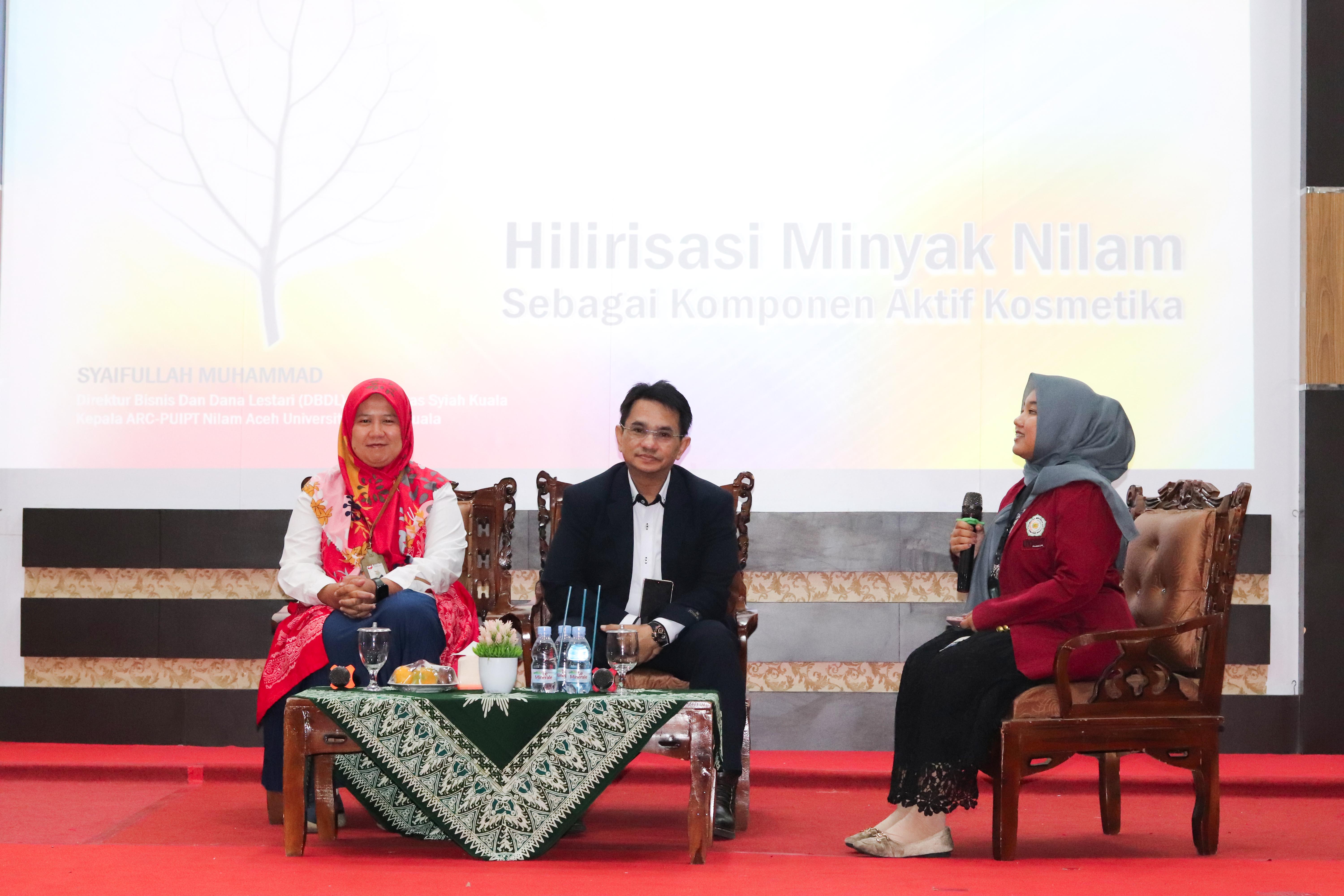 Syaifullah Muhammad, S.T M.Eng, Ph.D yang juga Direktur Bisnis Dana Lestari (BDL) Universitas Syiah Kuala Aceh tersebut memaparkan hilirisasi minyak nilam sebagai komponen aktif kosmetika. Beliau menjelaskan awal sejarah minyak nilam yang pertama kali dibawa Belanda ke Pasaman Barat, berlanjut ke Sidikalang dan kemudian Tapak Tuan. Beliau juga memaparkan 3 species nilam dan peta penghasil minyak nilam di Indonesia terutama roadmap Industri nilam Aceh.