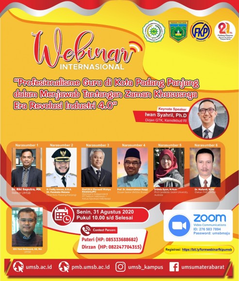 FKIP UMSB adakan Webinar Internasional dengan tema "Frofesionalisme Guru di Kota Padang Panjang dalam Menjawab Tantangan Zaman Khususnya Era Revolusi Industri 4.0" pada hari Senin, 31 Agustus 2020 di Zoom Pukul 10.00 s/d selesai